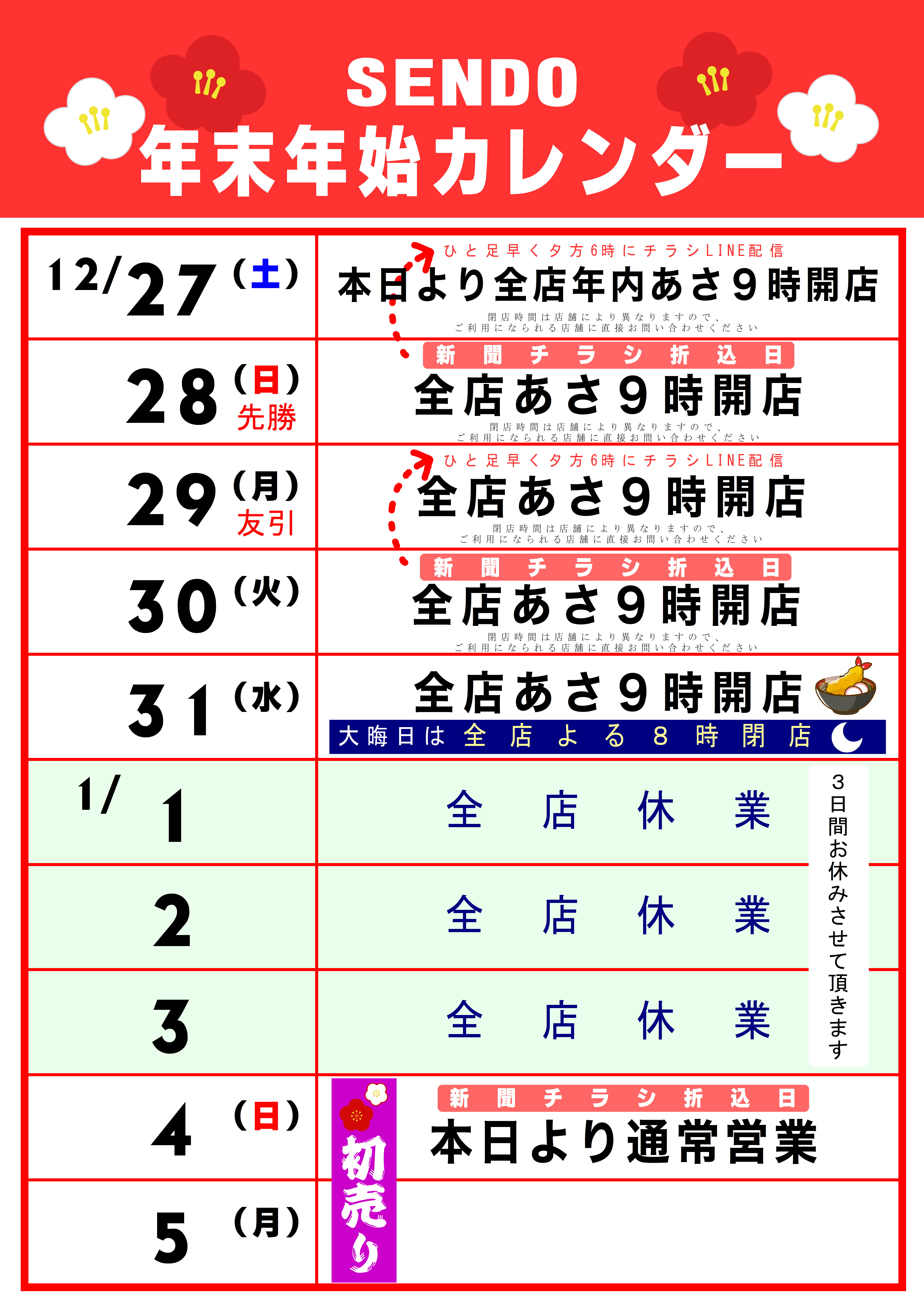 せんどう全店の年末年始の営業はご覧の通りとなります。