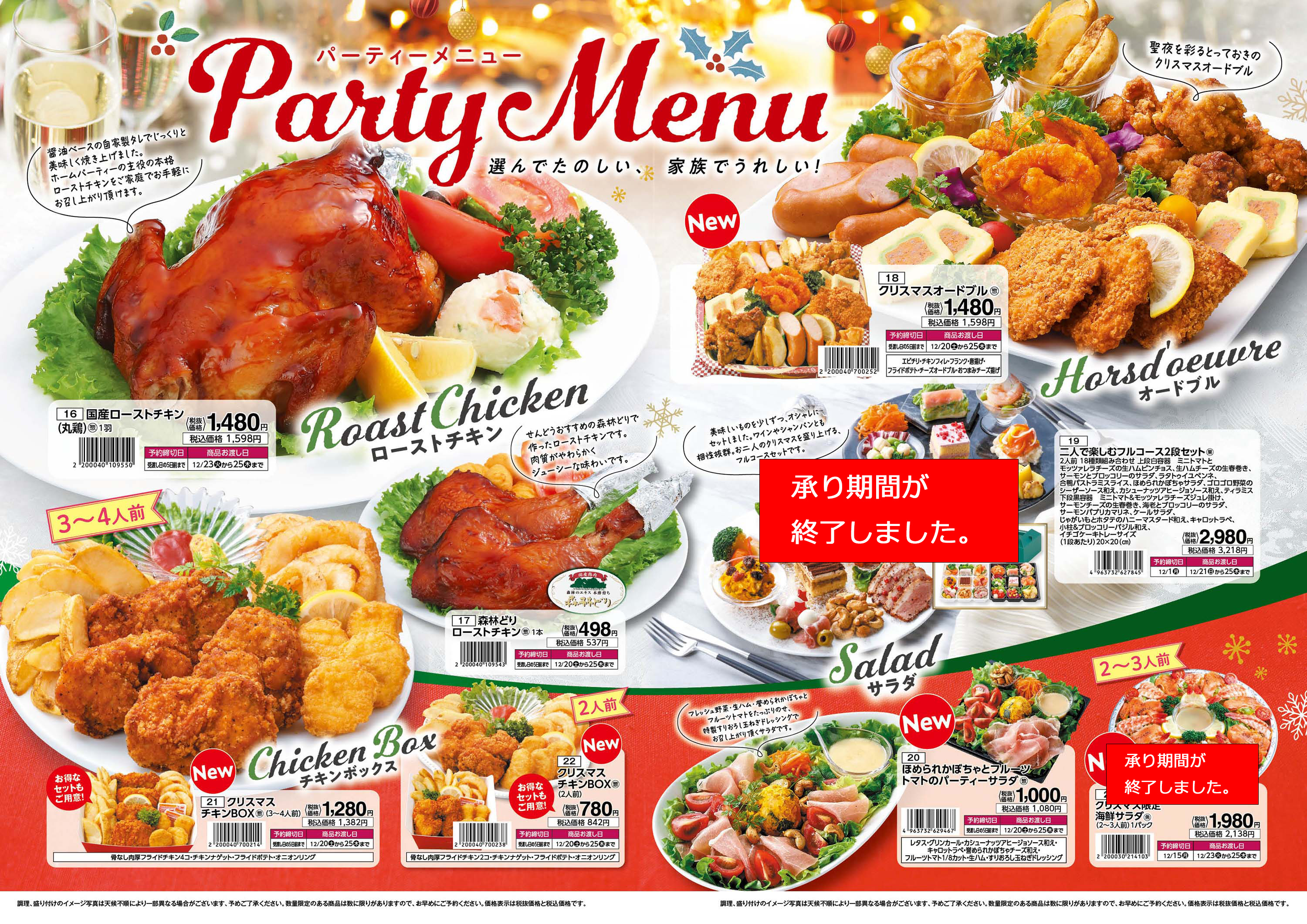 オードブルやローストチキン、ローストビーフまでパーティーメニューを取り揃えました。